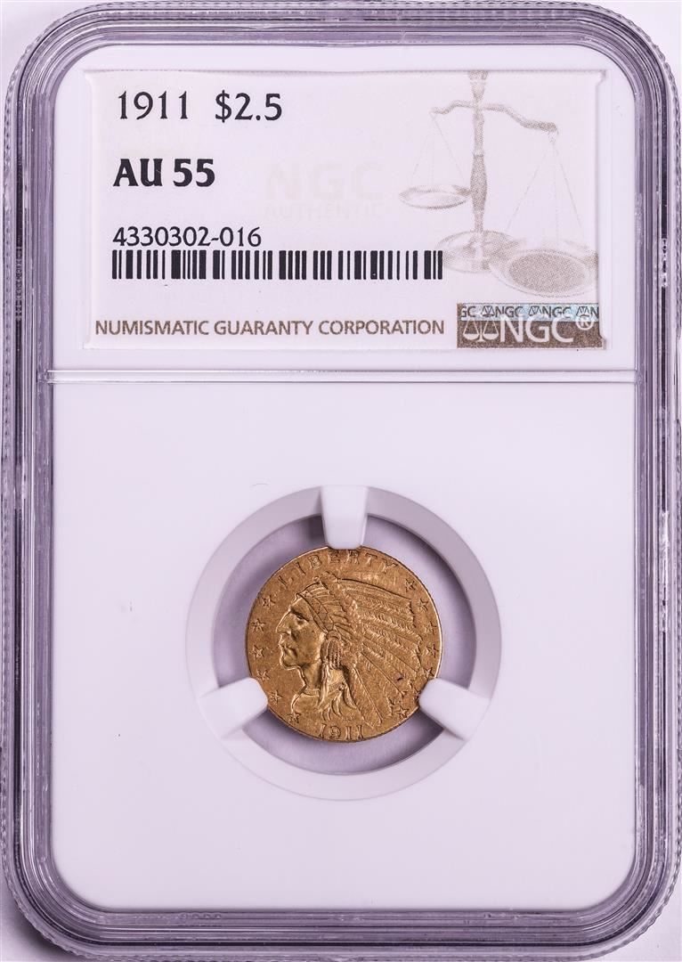 One 1911 $2 1/2 Indian Head Quarter Eagle Gold Coin NGC AU55. NGC Certified.