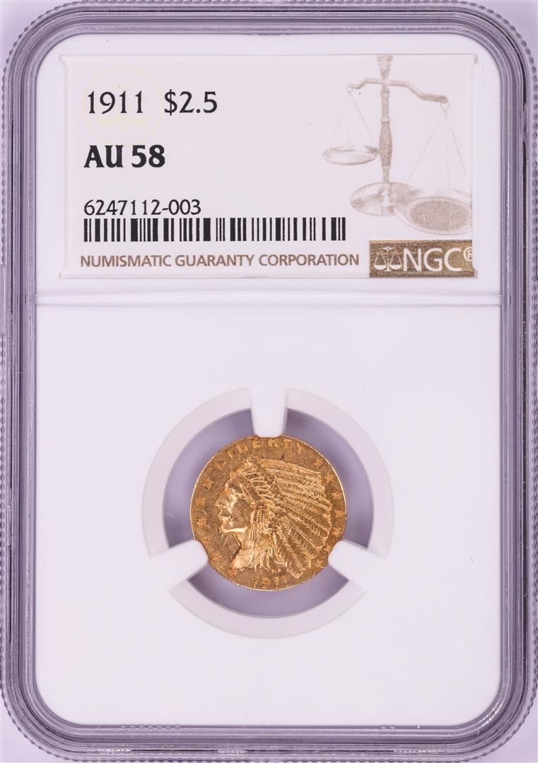 One 1911 $2 1/2 Indian Head Quarter Eagle Gold Coin NGC AU58. NGC Certified.