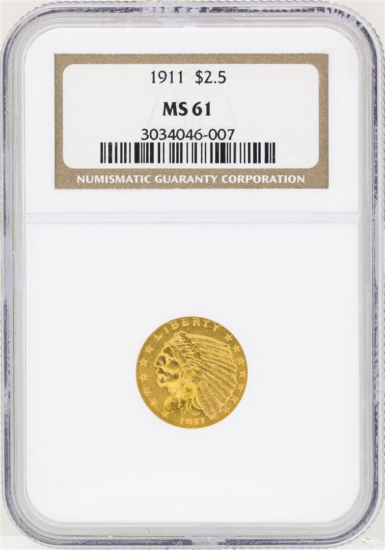 One 1911 $2 1/2 Indian Head Quarter Eagle Gold Coin NGC MS61. NGC Certified.