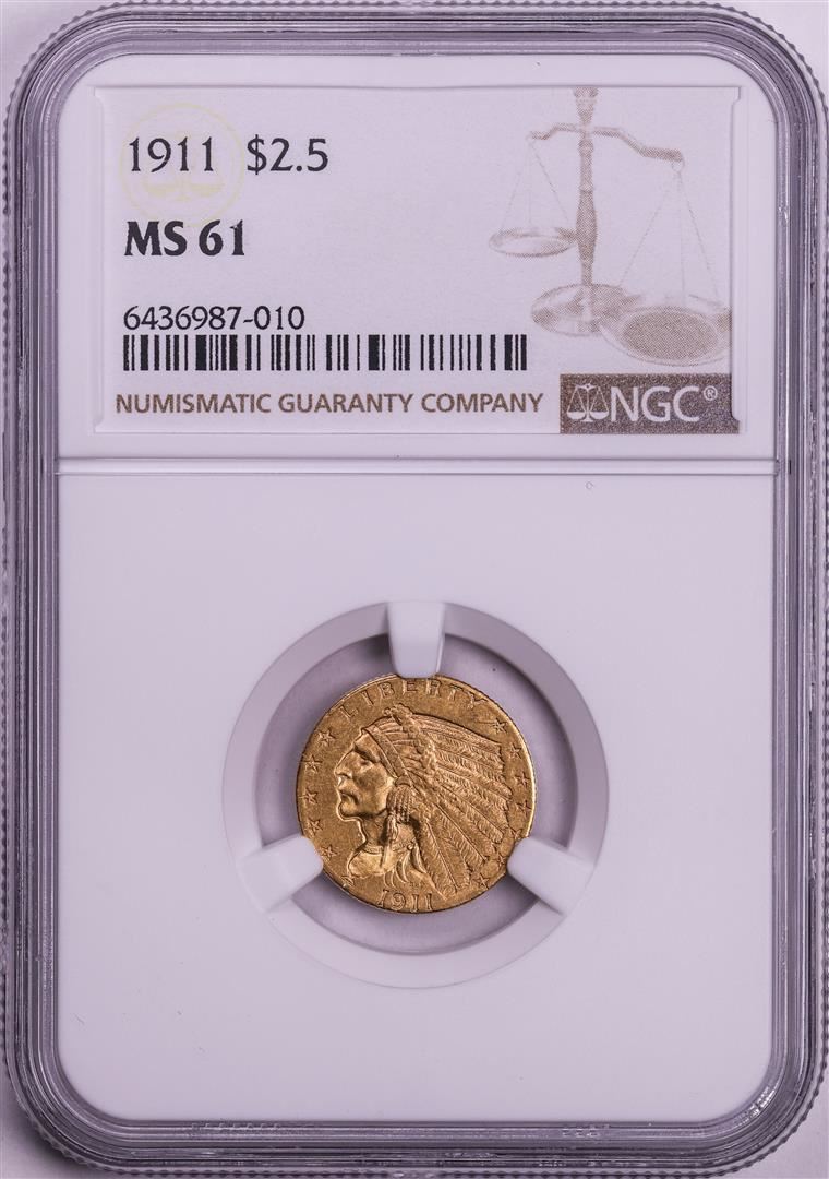 One 1911 $2 1/2 Indian Head Quarter Eagle Gold Coin NGC MS61. NGC Certified.