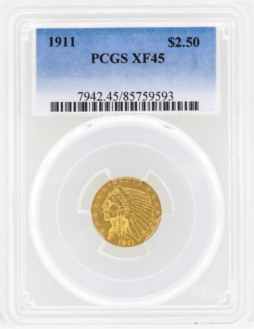 One 1911 $2 1/2 Indian Head Quarter Eagle Gold Coin PCGS XF45. PCGS Graded.