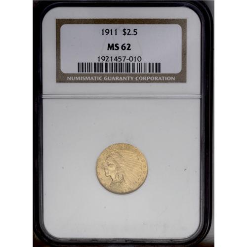1911 $2 1/2 MS62 NGC. A smooth olive-gold example of t 1911[$2 1/2] MS62 NGC.