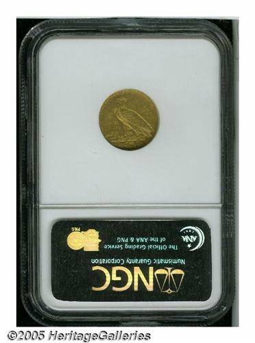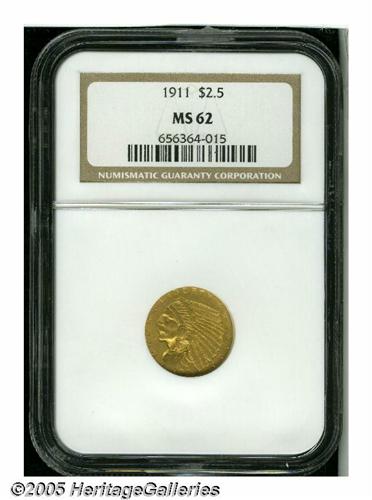<B>1911<$2 1/2> MS62 NGC.</B></I> The smooth surfaces have a distinctly matte-like appearance. Pleasing light coloration indicates a lack of toning, and the typical satin luster is rather muted, which limits the grade of the piece. Both sides seem carefully preserved, however, and are nearly blemish-free.