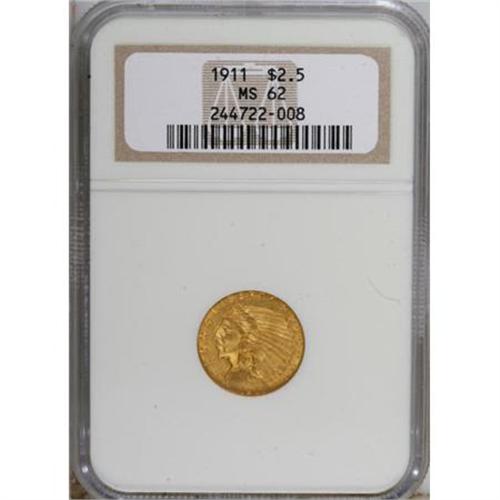 <B>1911 $2 1/2 MS62 NGC.</B></I> NGC Census: (2700/2156). PCGS Population (1245/1396). Mintage: 704,000. Numismedia Wsl. Price for NGC/PCGS coin in MS62: $480. (#7942)<BR><BR><B>Coin Engraver:</B> Bela Lyon Pratt<BR><BR><b>Shipping:</b> Coins & Currency (<a target="_blank" href="http://www.heritageauctions.com/common/shipping.php">view shipping information</a>\)