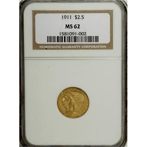 <B>1911 $2 1/2 MS62 NGC.</B></I> NGC Census: (2737/2195). PCGS Population (1257/1483). Mintage: 704,000. Numismedia Wsl. Price for NGC/PCGS coin in MS62: $500. (#7942)<BR><BR><B>Coin Engraver:</B> Bela Lyon Pratt<BR><BR><b>Shipping:</b> Coins & Currency (<a target="_blank" href="http://www.heritageauctions.com/common/shipping.php">view shipping information</a>)