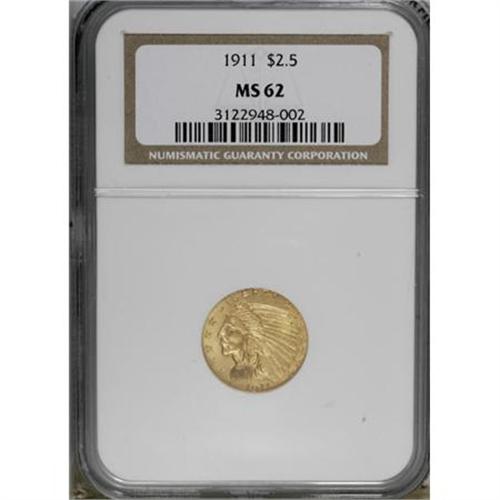 <B>1911 $2 1/2 MS62 NGC.</B></I> . NGC Census: (2865/2297). PCGS Population (1330/1593). Mintage: 704,000. Numismedia Wsl. Price for NGC/PCGS coin in MS62: $475. (#7942)<BR><BR><B>Coin Engraver:</B> Bela Lyon Pratt<BR><BR><b>Shipping:</b> Coins & Currency (<a target="_blank" href="http://www.heritageauctions.com/common/shipping.php">view shipping information</a>)