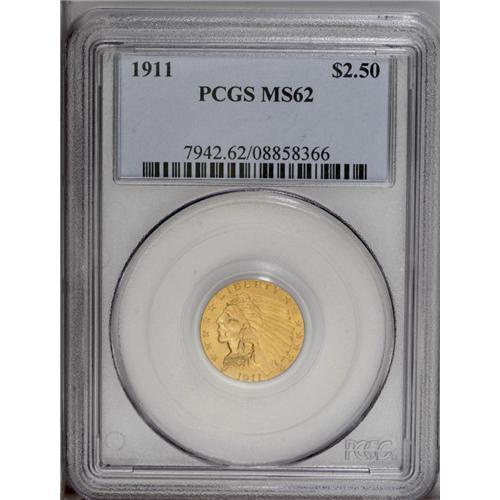 <B>1911<$2 1/2> MS62 PCGS.</B></I> Quite attractive for the grade with bright orange-gold surfaces that are lustrous and free of the usual field abrasions.