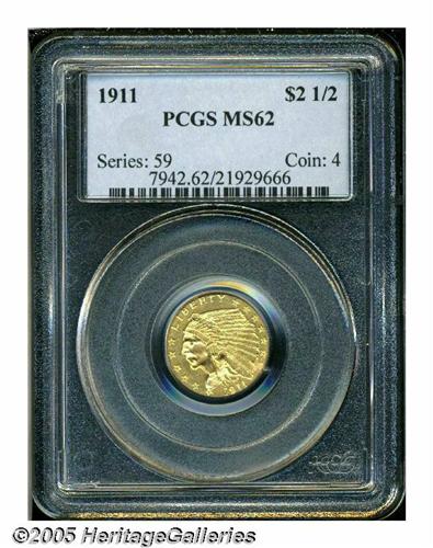 <B>1911<$2 1/2> MS62 PCGS.</B></I> Sharply struck with pleasing surfaces and pale yellow-gold luster. A popular issue due in part to the rarity of the branch Mint issue struck in Denver.