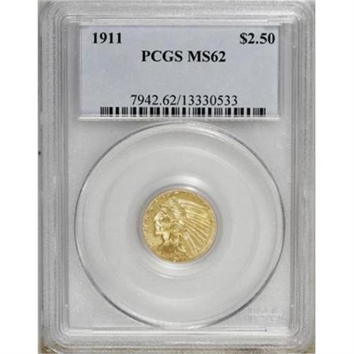 <B>1911 $2 1/2 MS62 PCGS.</B></I> PCGS Population (1314/1551). NGC Census: (2831/2267). Mintage: 704,000. Numismedia Wsl. Price for NGC/PCGS coin in MS62: $480. (#7942)<BR><BR><B>Coin Engraver:</B> Bela Lyon Pratt<BR><BR><b>Shipping:</b> Coins & Currency (<a target="_blank" href="http://www.heritageauctions.com/common/shipping.php">view shipping information</a>)