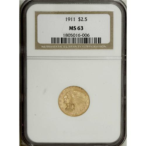 <B>1911 $2 1/2 MS63 NGC.</B></I> A frosted example of this popular type, in a pleasing state of preservation. The strike is sharp with the eagle's feathers in full definition.<BR><BR><b>Shipping:</b> Coin/Currency (<a target="_blank" href="http://www.heritageauctions.com/common/shipping.php">view shipping information</a>)
