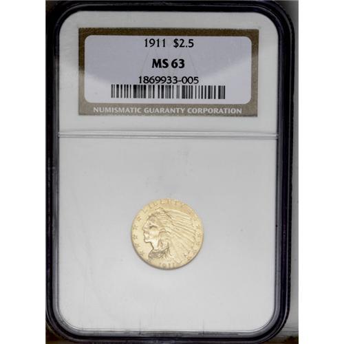 1911 $2 1/2 MS63 NGC. Bright, lustrous, and well struc