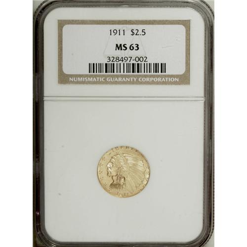 <B>1911 $2 1/2 MS63 NGC.</B></I> Bright wheat-gold surfaces have a trace of forest-green on the reverse. Well-preserved overall, though a number of ticks are present on the Indian's cheekbone.<BR><BR><b>Shipping:</b> Coin/Currency (<a target="_blank" href="http://www.heritageauctions.com/common/shipping.php">view shipping information</a>)