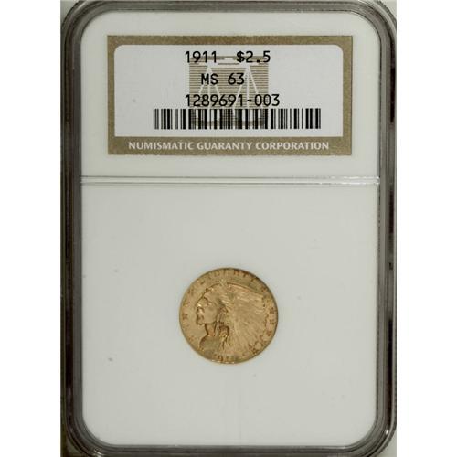 <B>1911 $2 1/2 MS63 NGC.</B></I> Lustrous peach-gold surfaces display traces of orange, and exhibit well impressed design features. The few minor handling marks are not offensive.<BR><BR><b>Shipping:</b> Coin/Currency (<a target="_blank" href="http://www.heritageauctions.com/common/shipping.php">view shipping information</a>)