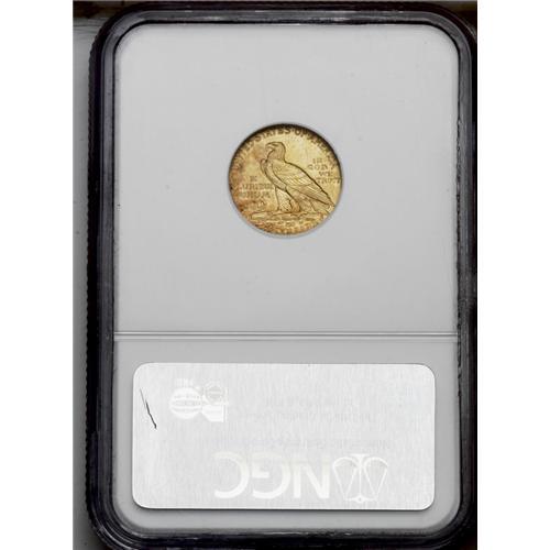 <B>1911<$2 1/2> MS63 NGC.</B></I> This understated coin has subtle luster on its mellowing yellow-orange surfaces. The field to the left of the well-defined eagle fades to a sunset red.