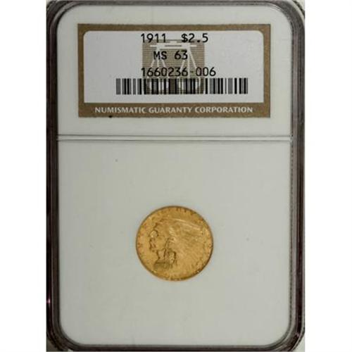 <B>1911 $2 1/2 MS63 NGC.</B></I> NGC Census: (1362/833). PCGS Population (851/631). Mintage: 704,000. Numismedia Wsl. Price for NGC/PCGS coin in MS63: $925. (#7942)<BR><BR><B>Coin Engraver:</B> Bela Lyon Pratt<BR><BR><b>Shipping:</b> Coins & Currency (<a target="_blank" href="http://www.heritageauctions.com/common/shipping.php">view shipping information</a>)