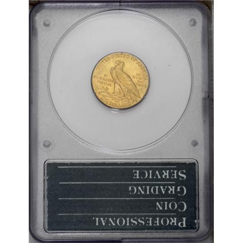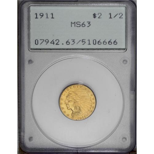 <B>1911 $2 1/2 MS63 PCGS.</B></I> A satiny and unblemished Quarter Eagle, not fully brought up on the lowest headdress feather but generally boldly struck. Certified in a first generation holder.
