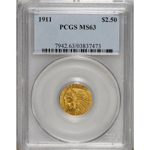 <B>1911 $2 1/2 MS63 PCGS.</B></I> Fully struck, the yellow-gold surfaces are clean and satiny with the usual matte-like texture.<BR><BR><b>Shipping:</b> Coins & Currency (<a target="_blank" href="http://www.heritageauctions.com/common/shipping.php">view shipping information</a>)