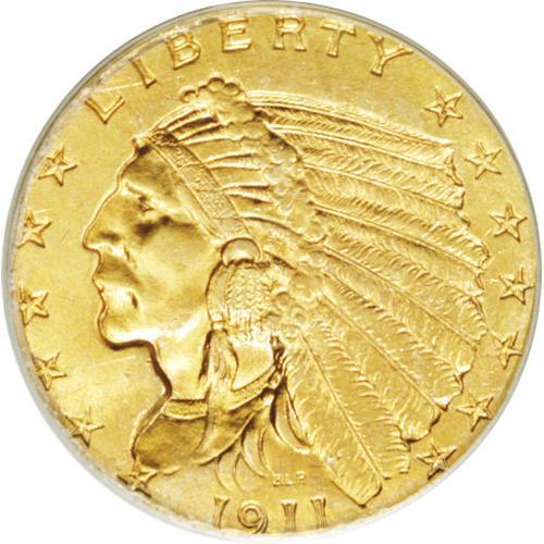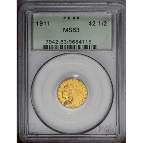 <B>1911<$2 1/2> MS63 PCGS.</B></I> Soft reddish-golden color throughout this Indian. The coin exhibits faint bagmarks in the obverse field. A nicely preserved piece.<BR><I>From The Sandia Mountain Collection.</B></I>