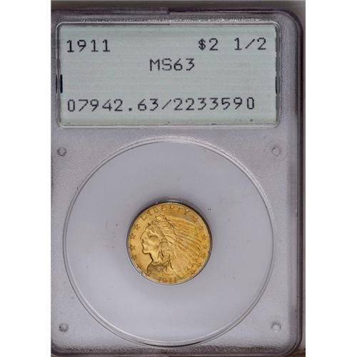 <B>1911<$2 1/2> MS63 PCGS.</B></I> The lowest headdress feathers are not absolutely defined, but the overall strike is good. Lustrous lemon-tinged fields and devices are devoid of identifiable marks. Housed in a first generation holder.