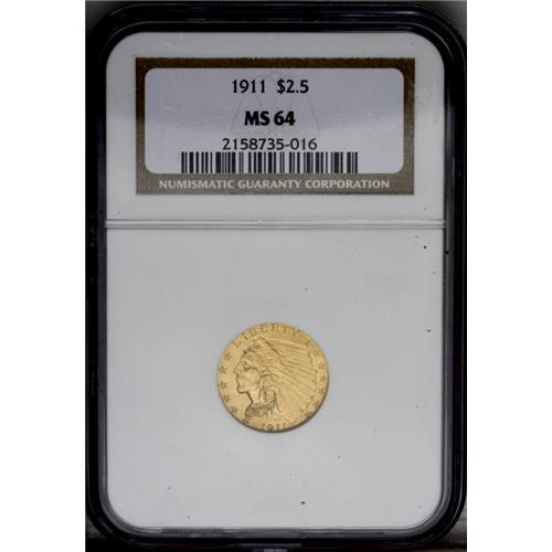 <B>1911<$2 1/2> MS64 NGC.</B></I> An attractive, deep golden piece with touches of brighter mint luster. The coin has a sharp overall look, and the surfaces show few significant marks. A wonderful addition to a type set of gold coinage. <BR><BR><B>Important notice:</B> Heritage usually auctions material at the rate of 200-250 lots per hour. On some occasions eBay Live bid software or the Internet may not be able to keep up with the pace of the auction. We recommend placing a realistic absentee bid now as insurance to avoid disappointment. Occasionally the auctioneer may eliminate or reject an eBay Live bid, and the auctioneer may also reopen a lot after the close of the eBay live bidding (usually because we missed an audience bid), and may reject your bid even if it shows you as the winning bidder. By bidding via eBay Live, you agree that Heritage may award the lot to another bidder at its sole discretion under the circumstances described above or any other reasonable circumstances. Since eBay bids are not shown to us until we open the lot on the floor, we treat those bids just like floor bids. In most cases the floor responds before the eBay bid is presented to us, due to Internet lag time, so for consistency we have made it a policy that floor bids are always considered first over tie eBay live bids. Also please note that all Heritage lots purchased through eBay Live carry a 20% Buyer's Premium. Please make sure you read the Terms and Conditions before you bid. This lot is being auctioned in conjunction with a live floor auction by Heritage Galleries & Auctioneers. All final auction and invoice information will be supplied by Heritage Galleries & Auctioneers, and all other information should be considered preliminary. Lot:2480 <BR><BR><B>Winning Notification and Billing:</B> After the FINAL session in this auction is complete, Heritage will send e-mail and snail mail invoices. This process normally takes several days. All final auction and invoice information will be supplied by Heritage Galleries & Auctioneers, and all other information should be considered preliminary. <BR><BR>This auction will be conducted on a live auction floor and over the Internet through eBay Live. If you choose to place an absentee bid, please take a moment to <font color='#0000ff'><u><a href='http://pages.ebay.com/liveauctions/help/before/laabsentee.html'>learn how eBay Live absentee bidding works</a></u></font><font color='#000000'>