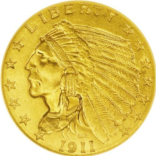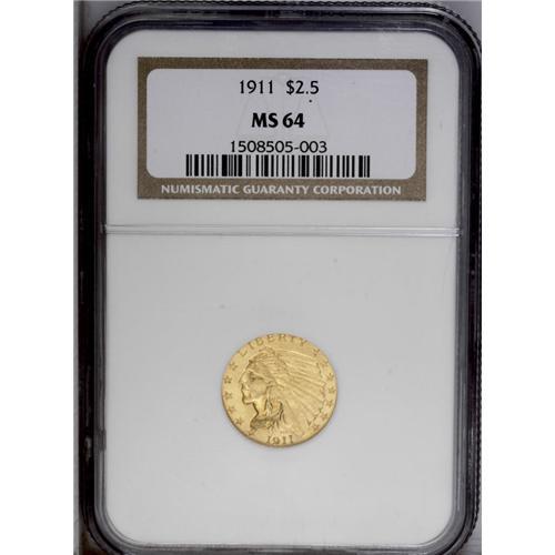 <B>1911<$2 1/2> MS64 NGC.</B></I> An uncommonly bright and lustrous example of this challenging gold type coin. The striking details are also above average with nearly complete definition on the bottom feather of the Indian's headdress. Notably free from the large, distracting abrasions that are usually seen on Indian quarter eagles.