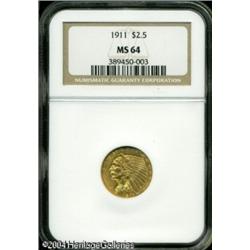 1911 $2 1/2 MS64 NGC. Indian Quarter Eagles are a <B>1911 $2 1/2 MS64 NGC.</B></I> Indian Quarter Eagles are a rare find in this condition because of the incuse design. Bringing the fields up as the highest portion of the coin made them especially susceptible to abrasions. This is a lovely piece that must look very nearly as it did in the year of issue. Fully struck and showing no meaningful abrasions, the surfaces are a lustrous honey-golden color. <BR><BR><B>Important notice:</B> Heritage usually auctions material at the rate of 200-250 lots per hour. On some occasions eBay Live bid software or the Internet may not be able to keep up with the pace of the auction. We recommend placing a realistic absentee bid now as insurance to avoid disappointment. Occasionally the auctioneer may eliminate or reject an eBay Live bid, and the auctioneer may also reopen a lot after the close of the eBay live bidding (usually because we missed an audience bid), and may reject your bid even if it shows you as the winning bidder. By bidding via eBay Live, you agree that Heritage may award the lot to another bidder at its sole discretion under the circumstances described above or any other reasonable circumstances. Since eBay bids are not shown to us until we open the lot on the floor, we treat those bids just like floor bids. In most cases the floor responds before the eBay bid is presented to us, due to Internet lag time, so for consistency we have made it a policy that floor bids are always considered first over tie eBay live bids. Also please note that all Heritage lots purchased through eBay Live carry a 20% Buyer's Premium. Please make sure you read the Terms and Conditions before you bid. This lot is being auctioned in conjunction with a live floor auction by Heritage Galleries & Auctioneers. All final auction and invoice information will be supplied by Heritage Galleries & Auctioneers, and all other information should be considered preliminary. Lot:6548