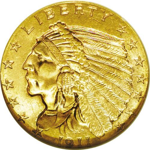 <B>1911<$2 1/2> MS64 NGC.</B></I> Indian quarter eagles are often difficult to find in this condition because of the incuse design. Bringing the fields up as the highest portion of the coin made them especially susceptible to abrasions. This is a lovely piece that must look very nearly as it did in the year of issue. Fully struck and showing no meaningful abrasions, the surfaces are a lustrous light golden color.