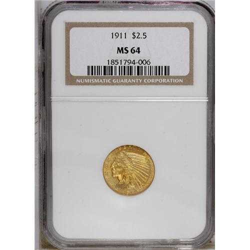 <B>1911 $2 1/2 MS64 NGC.</B></I> Solidly struck and satiny with well-preserved honey-gold surfaces. Only a few tiny marks are noted on the Indian's cheek and headdress.<BR><BR><b>Shipping:</b> Coin/Currency (<a target="_blank" href="http://www.heritageauctions.com/common/shipping.php">view shipping information</a>)