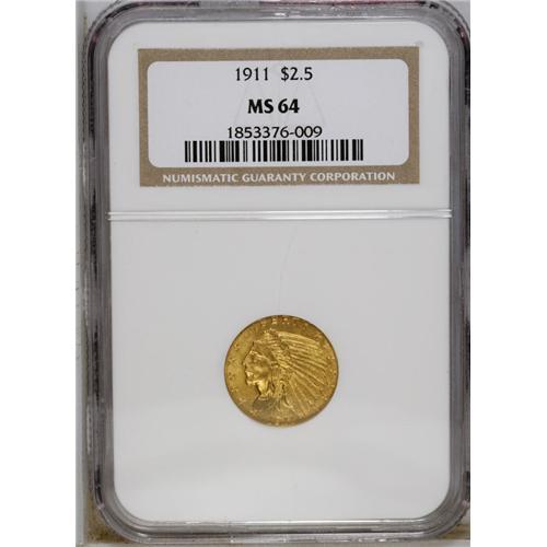 <B>1911 $2 1/2 MS64 NGC.</B></I> Suitably struck with above-average luster. Only a few small, shallow marks in the yellow-gold fields keep this piece from a Gem grade.<BR><BR><b>Shipping:</b> Coins & Currency (<a target="_blank" href="http://www.heritageauctions.com/common/shipping.php">view shipping information</a>)