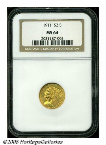<B>1911<$2 1/2> MS64 NGC.</B></I> Typically struck with nice satiny luster and the near-absence of any surface marks. An abundant amount of reddish-golden color blankets each side.