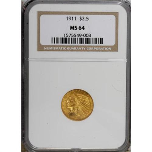 <B>1911 $2 1/2 MS64 NGC.</B></I> The eye appeal of this Choice Uncirculated example is enhanced by a subtle interplay of lime and pastel peach hues over each side. The fine-grain surfaces exhibit pleasing satin luster and are surprisingly clean for the grade. A readily available issue that is much more affordable than its Denver Mint cousin. <BR><BR><b>Shipping:</b> Coins & Currency (<a target="_blank" href="http://www.heritageauctions.com/common/shipping.php">view shipping information</a>)