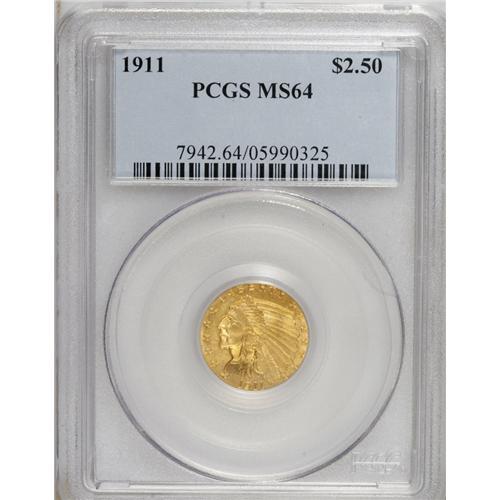 <B>1911 $2 1/2 MS64 PCGS.</B></I> A well preserved near-Gem whose smooth and nicely struck olive-gold surfaces are suggestive of an even finer grade. A somewhat better date in this quality.<BR><BR><b>Shipping:</b> Coins & Currency (<a target="_blank" href="http://www.heritageauctions.com/common/shipping.php">view shipping information</a>)