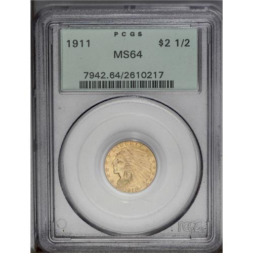 <B>1911 $2 1/2 MS64 PCGS.</B></I> The satiny surfaces of this quarter eagle are greenish-gold with some yellow areas. The left obverse and right reverse fields have several luster grazes.<BR><BR><b>Shipping:</b> Coin/Currency (<a target="_blank" href="http://www.heritageauctions.com/common/shipping.php">view shipping information</a>)