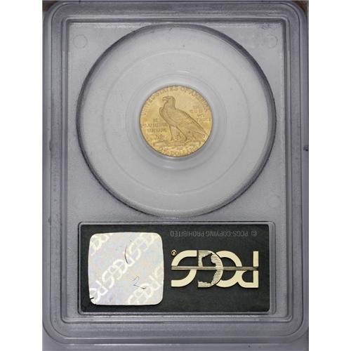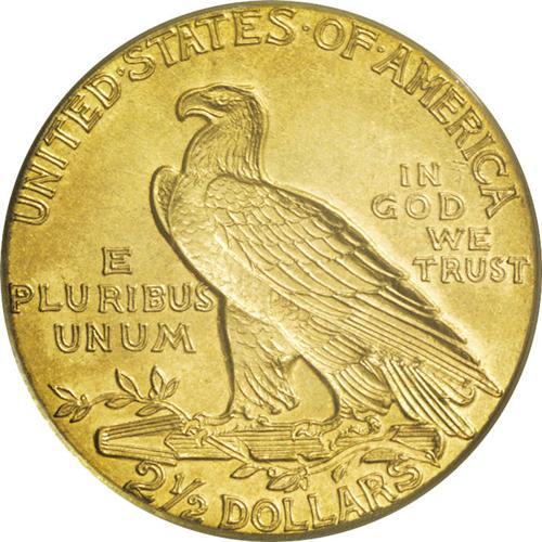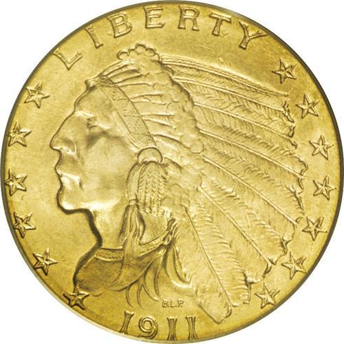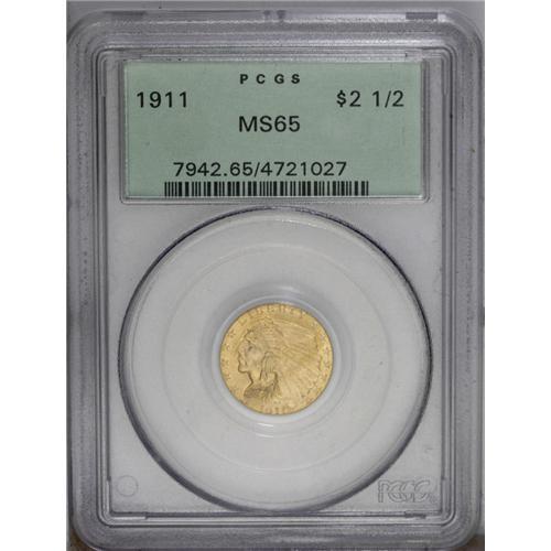 <B>1911 $2 1/2 MS65 PCGS.</B></I> Orange and lime tints grace this satiny and nearly unmarked Gem. The Indian's cheekbone has a hint of olive toning. A good strike, as only the lowest half of the headdress is not boldly delineated by the dies. Housed in a green label holder. An available date in low Mint State grades, but challenging in Gem condition. As of (1/06), PCGS has certified just one example in a higher grade.