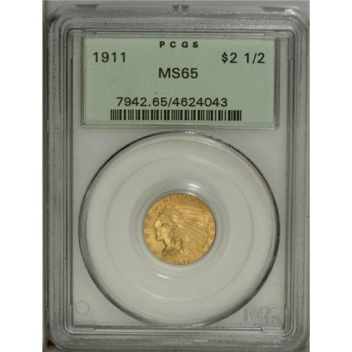 <B>1911 $2 1/2 MS65 PCGS.</B></I> Peach and green-gray toning drape this lustrous and original Gem. Both the fields and devices are gorgeously smooth, and the strike is distinctive, even on the lower half of the headdress. Virtually unimprovable quality for this conditionally rare issue. Encapsulated in a green label holder. Population: 57 in 65, 1 finer (10/06).<BR><BR><b>Shipping:</b> Coin/Currency (<a target="_blank" href="http://www.heritageauctions.com/common/shipping.php">view shipping information</a>)