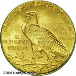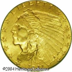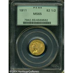 1911 $2 1/2 MS65 PCGS. The Indian Quarter Eagle is <B>1911 $2 1/2 MS65 PCGS.</B></I> The Indian Quarter Eagle is seldom found in the better grades of Uncirculated as the incuse design caused even the slightest abrasions to show on these coins. This is a lovely exception that shows only the most inconsequential marks on the reverse. Both sides are covered with thick mint frost that displays variegated shadings of rose-gold, orange, and pale green patina. <BR><BR><B>Important notice:</B> Heritage usually auctions material at the rate of 200-250 lots per hour. On some occasions eBay Live bid software or the Internet may not be able to keep up with the pace of the auction. We recommend placing a realistic absentee bid now as insurance to avoid disappointment. Occasionally the auctioneer may eliminate or reject an eBay Live bid, and the auctioneer may also reopen a lot after the close of the eBay live bidding (usually because we missed an audience bid), and may reject your bid even if it shows you as the winning bidder. By bidding via eBay Live, you agree that Heritage may award the lot to another bidder at its sole discretion under the circumstances described above or any other reasonable circumstances. Since eBay bids are not shown to us until we open the lot on the floor, we treat those bids just like floor bids. In most cases the floor responds before the eBay bid is presented to us, due to Internet lag time, so for consistency we have made it a policy that floor bids are always considered first over tie eBay live bids. Also please note that all Heritage lots purchased through eBay Live carry a 20% Buyer's Premium. Please make sure you read the Terms and Conditions before you bid. This lot is being auctioned in conjunction with a live floor auction by Heritage Galleries & Auctioneers. All final auction and invoice information will be supplied by Heritage Galleries & Auctioneers, and all other information should be considered preliminary. Lot:6549