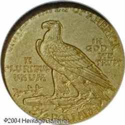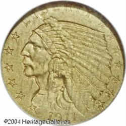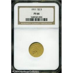 1911 $2 1/2 PR66 NGC. Proof gold from 1911 broke w <B>1911 $2 1/2 PR66 NGC.</B></I> Proof gold from 1911 broke with the two-year experiment of the "Roman Gold" variant used in 1909 and 1910, and the matte finish was reinstituted this year as it had been originally in 1908. Like the mintage of the 1910, the mintage of 191 proofs for the 1911 Quarter Eagle seems extraordinarily high for an issue where perhaps no more than 60-75 pieces may still be extant. The matte or sandblast surface differs somewhat in texture and color from those of 1908 with more sparkle on the 1911 and also more of a distinctive olive-khaki color.<BR> This piece is one of the finer specimens of matte proof coinage we have recently seen from this denomination. The surfaces smooth and unabraded with only a couple of areas of "shiny spots" (a.k.a. luster breaks), these being visible only at certain angles. Certainly an exceptional example for the advanced collector of proof gold. <BR><BR><B>Important notice:</B> Heritage usually auctions material at the rate of 200-250 lots per hour. On some occasions eBay Live bid software or the Internet may not be able to keep up with the pace of the auction. We recommend placing a realistic absentee bid now as insurance to avoid disappointment. Occasionally the auctioneer may eliminate or reject an eBay Live bid, and the auctioneer may also reopen a lot after the close of the eBay live bidding (usually because we missed an audience bid), and may reject your bid even if it shows you as the winning bidder. By bidding via eBay Live, you agree that Heritage may award the lot to another bidder at its sole discretion under the circumstances described above or any other reasonable circumstances. Since eBay bids are not shown to us until we open the lot on the floor, we treat those bids just like floor bids. In most cases the floor responds before the eBay bid is presented to us, due to Internet lag time, so for consistency we have made it a policy that floor bids are always considered first over tie eBay live bids. Also please note that all Heritage lots purchased through eBay Live carry a 20% Buyer's Premium. Please make sure you read the Terms and Conditions before you bid. This lot is being auctioned in conjunction with a live floor auction by Heritage Galleries & Auctioneers. All final auction and invoice information will be supplied by Heritage Galleries & Auctioneers, and all other information should be considered preliminary. Lot:6587