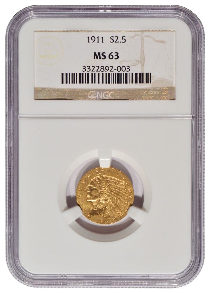 One 1911 $2.5 Indian Head Quarter Eagle Gold Coin NGC MS63.