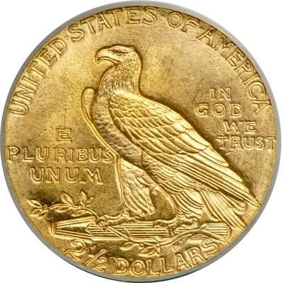 1911 $2.50 Indian. PCGS graded MS-64. Crisp golden frost, virtually undisturbed mint luster that is bright. We leave behind the luster, since it pretty much expresses itself to the viewer of the photographs, and move on to the devices. Even the most delicate detail seen on this Indian $5 shows it was made with uncommon exactness for the issue. Pop 601; 72 finer, 71 in 65, 1 in 66 (PCGS # 7942) .