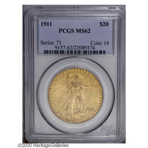 1911 $20 MS62 PCGS. A touch of flatness appears on Lib 1911[$20] MS62 PCGS.