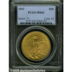 <B>1911 $20 MS62 PCGS.</B></I> Almost 200,000 pieces were minted of this issue. Honey-gold surfaces exhibit the usual matte-like texture and soft luster. The design features are well struck up. A few minute marks are noted over the obverse.