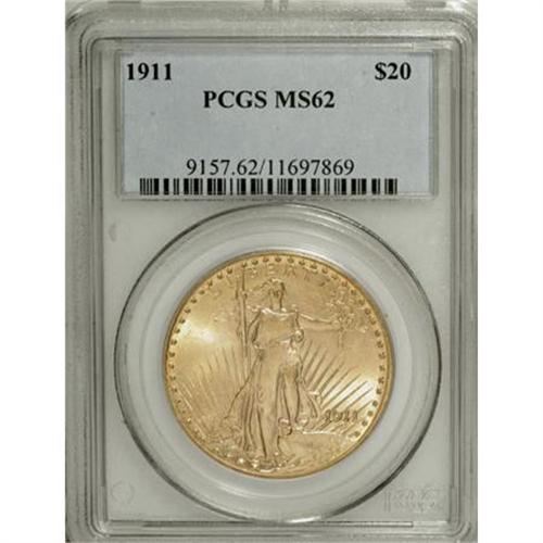 <B>1911 $20 MS62 PCGS.</B></I> PCGS Population (490/871). NGC Census: (749/747). Mintage: 197,200. Numismedia Wsl. Price for NGC/PCGS coin in MS62: $800. (#9157)<BR><BR><B>Coin Engraver:</B> Augustus Saint-Gaudens<BR><BR><b>Shipping:</b> Coins & Currency (<a target="_blank" href="http://www.heritageauctions.com/common/shipping.php">view shipping information</a>\)