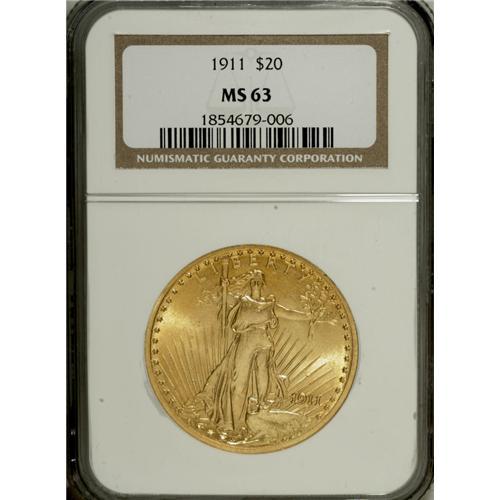 <B>1911 $20 MS63 NGC.</B></I> This lustrous lemon-gold example has fewer marks than is customary for the MS63 level, despite a minor rim nick at 7:30 on the reverse. Crisply struck save for slight blending of detail on Liberty's chest and raised knee.<BR><BR><b>Shipping:</b> Coins & Currency (<a target="_blank" href="http://www.heritageauctions.com/common/shipping.php">view shipping information</a>)