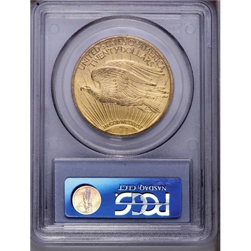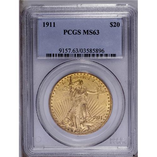 <B>1911<$20> MS63 PCGS.</B></I> The finely granular matte-like surfaces are adorned over both sides by enticing yellow-gold and peach coloration. Bold striking details are exhibited throughout, as relatively minor nicks and superficial field grazes define the numerical grade of the piece.