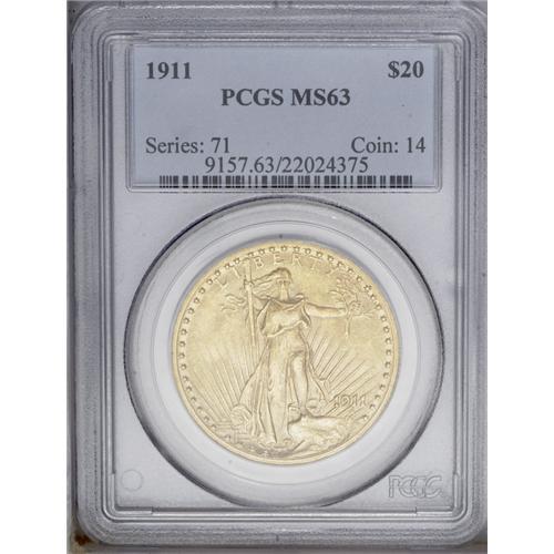 <B>1911<$20> MS63 PCGS.</B></I> This is a scarce date from a mintage of just 197,200 pieces and a low number of survivors. Mint State examples are always in demand. Fully brilliant with lustrous yellow-gold surfaces.