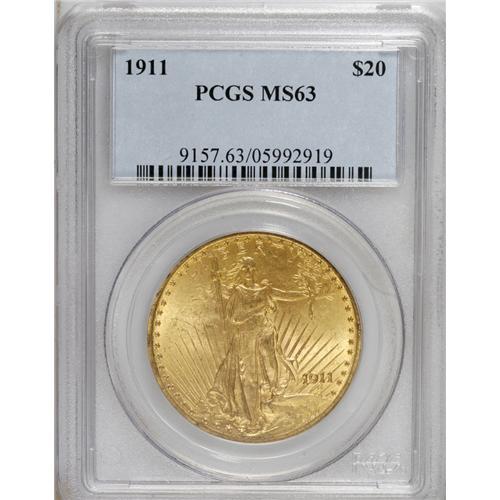 <B>1911 $20 MS63 PCGS.</B></I> Yellow-gold patina displays tints of light green, and the design elements are nicely brought up. A few grade-defining, but largely inoffensive, marks are visible on the obverse.<BR><BR><b>Shipping:</b> Coins & Currency (<a target="_blank" href="http://www.heritageauctions.com/common/shipping.php">view shipping information</a>)