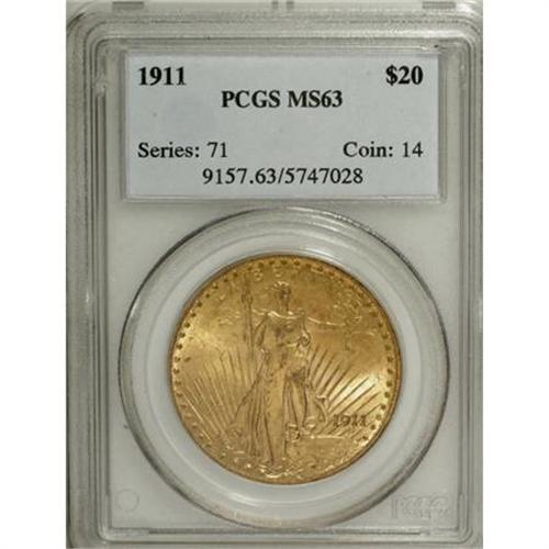 <B>1911 $20 MS63 PCGS.</B></I> Lustrous peach-gold surfaces display a fine grainy finish and well impressed design elements. The grade is determined by a few minute marks on each side.<B><BR></B></I><I>From The Carlton Woods Collection.</B></I><BR><BR><B>Coin Engraver:</B> Augustus Saint-Gaudens<BR><BR><b>Shipping:</b> Coins & Currency (<a target="_blank" href="http://www.heritageauctions.com/common/shipping.php">view shipping information</a>\)