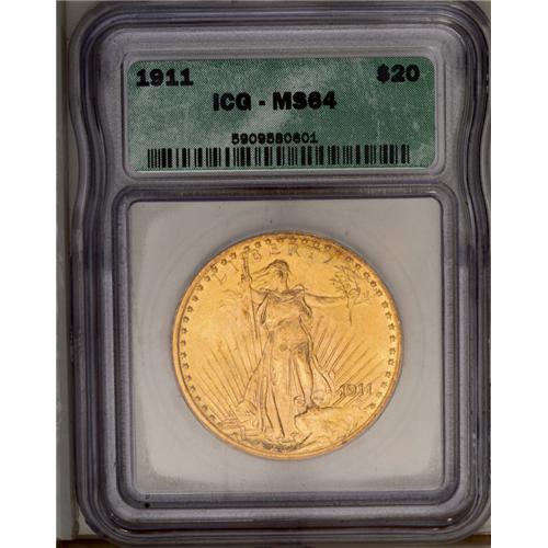 <B>1911<$20> MS64 ICG.</B></I> A superior example of this date, with refreshing, satiny fields displaying bright yellow-gold mint color, sharply struck details, and minimally abraded compared to most similar coins. Challenging to find in higher grades.
