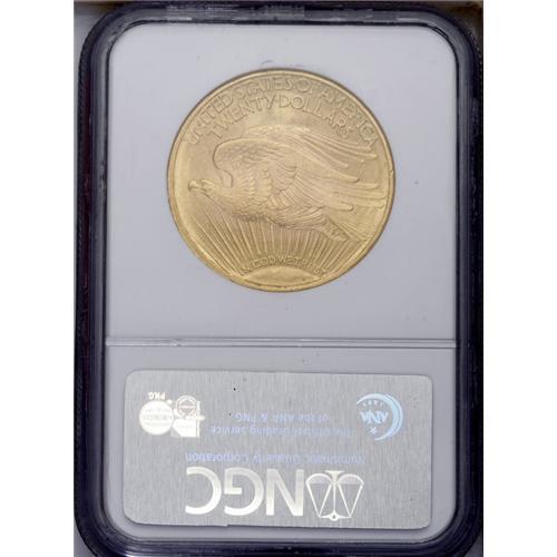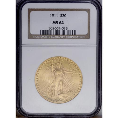 <B>1911 $20 MS64 NGC.</B></I> The 1911 Saint-Gaudens is a low mintage issue that usually tops out in the MS60 to MS62 range and is virtually unobtainable as a Gem. The distinctly matte-like surface textures of this near-Gem combine with softly frosted luster and pleasing coloration to allow an exceptional degree of eye appeal. A handful of minute tick marks are distributed over the two sides, but they are difficult to discern without a magnifier. A high-end example for the grade, and very near to Gem quality.