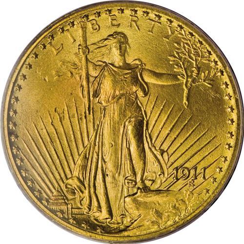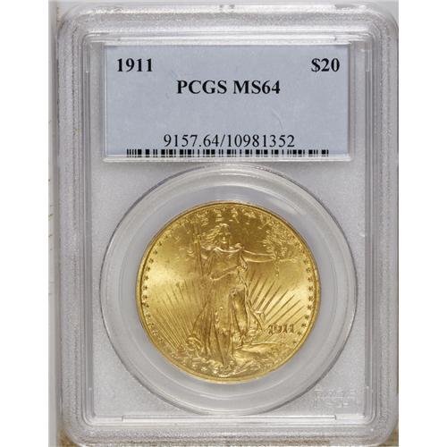 <B>1911 $20 MS64 PCGS.</B></I> A well struck honey-hued near-Gem that has soft but pleasing luster. Few marks appear on Liberty's body, though the fields have a number of ticks. The low mintage Philadelphia issues from the early 1910s have long been a favorite target of speculators.<BR><BR><b>Shipping:</b> Coin/Currency (<a target="_blank" href="http://www.heritageauctions.com/common/shipping.php">view shipping information</a>)